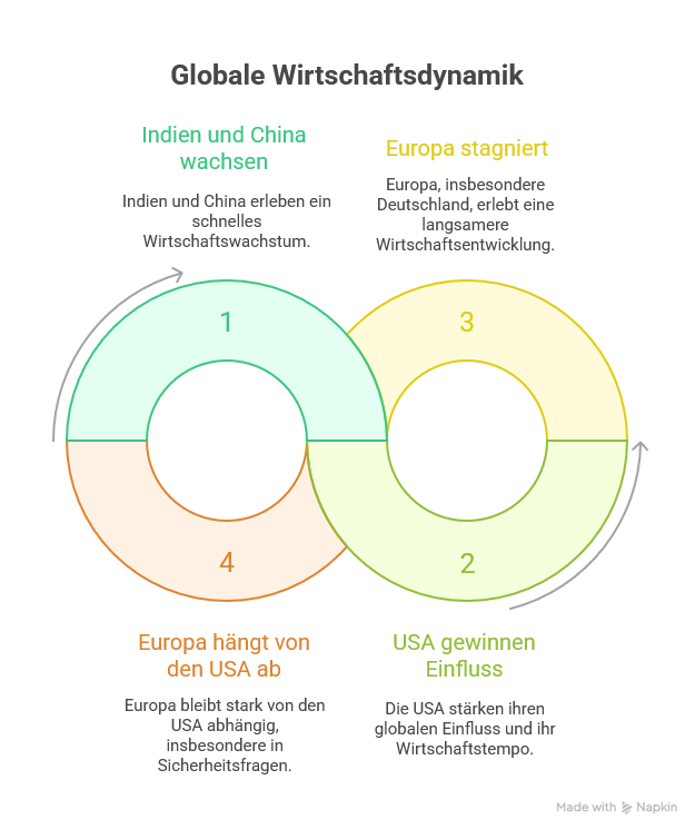 Indien, China und die USA beschleunigen ihre Wirtschaft, ihre Motoren brummen hörbar. Im Gegensatz dazu wirkt Europa, vorwiegend Deutschland, wie ein Reisender, der zu lange am Bahnhof verweilt. Europa hängt weiterhin stark an den Vereinigten Staaten. Die Diskussionen zur Sicherheit verstärken diese Abhängigkeit; sie wirken wie ein lauter, nicht zu ignorierender Nachhall. Die USA gewinnen Einfluss sowie Tempo, während Europa im globalen Wettbewerb eher zurückfällt. Beispiele gibt es zur Genüge: Cloud-Infrastrukturen, Content-Delivery-Networks, Chips, KI.